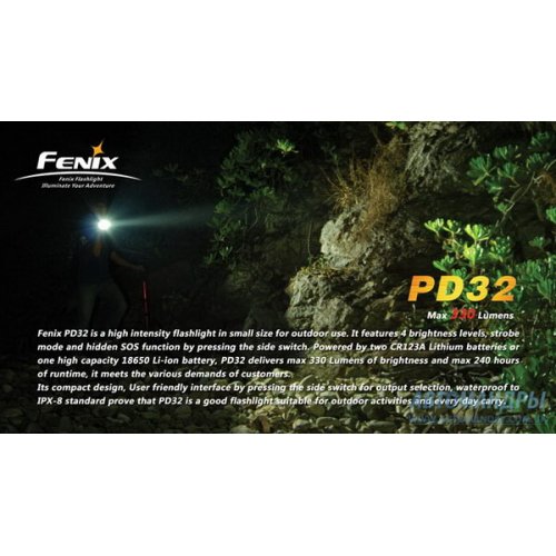 Cветодиодный фонарь Fenix PD32 S2 с клипсой, 6 режимов, яркость 330 люмен в турбо-режиме. Новинка 2012 года от Феникс, которая стала модификацией хорошо зарекомендовавшего себя фонаря PD31, продолжение легендарной серии EDC фонарей серии PD. Особенностью данной модели является обновленный функционал и новая кнопка переключения режимов. Степень защиты данного фонаря соответствует стандарту IPX-8, выдерживает погружение в воду. Фонарик работает от двух литиевых (Litium) батареек типоразмера CR123А либо от одной аккумуляторной батареи формата 18650. Один из лучших фонарей для автомобильных путешественников и пеших туристов! Купить фонарь Fenix Fenix PD32 S2 в магазине Автомандры www.automandry.com.ua с доставкой по Киеву и Украине!