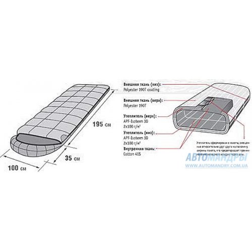- Внешний материал низ: Polyester 190T Diamond, RipStop PU 250 mm H2O
